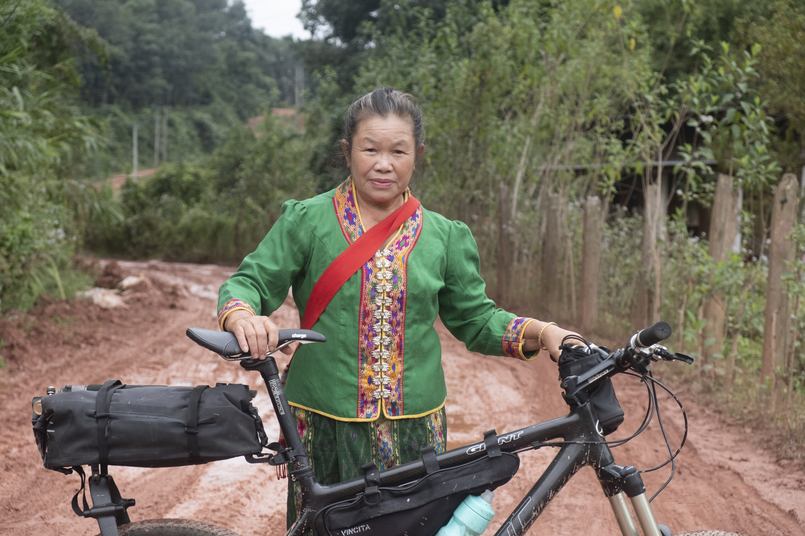 De 60 kilometer lange, oude en slechte weg tussen deze twee plaatsen volgt de loop van de Nam Tha- rivier en is een van mijn favoriete ritten in de regio. Langs de route liggen kleine stadjes, vooral Khmu- en Lanten-dorpen. Khmu- en Lanten-dorpen bevinden zich voornamelijk in het bergachtige noorden van Laos, waar deze etnische groepen traditioneel landbouw, jacht en ruilhandel beoefenen. In de Khmu-dorpen is er een sterke invloed van ouderen die verantwoordelijk zijn voor beslissingen en gemeenschapszaken. De dorpen van zowel de Khmu als de Lanten zijn vaak afgelegen, wat bijdraagt aan een levendige cultuur met veel traditionele elementen en weinig contact met de moderne wereld. De vrouwen dragen vaak witte beenbanden, blauw geweven kleding en hebben soms blauwe vingers van het verfproces. Dorpelingen lopen met manden vol brandhout op de rug en slechts op slippers aan hun voeten steken ze hang bruggen over die lopen tussen de rubberplantages en hun dorpen. Het is een hard bestaan en als fietser die er puur voor zijn plezier rijdt, voel je je soms wat ongemakkelijk – maar toch zijn de meesten gastvrij en nieuwsgierig naar mij en mijn camera.