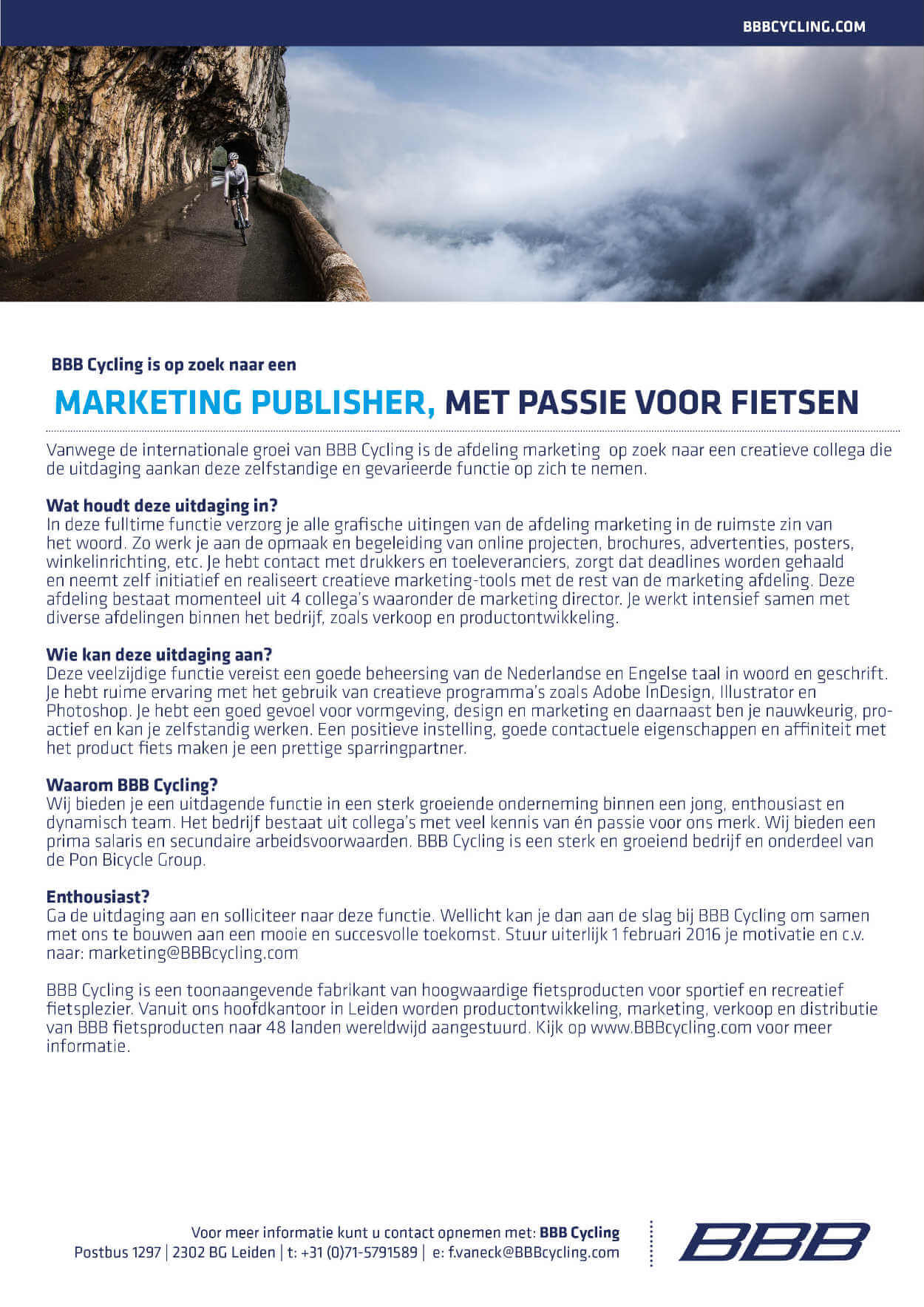 Heb je altijd al bij een Nederlands en toonaangevend bedrijf in de fietsbranche willen werken? Dan is dit misschien je kans! BBB Cycling is namelijk op zoek naar een ‘Marketing Publisher’ die alle grafische uitingen van de marketingafdeling in de ruimste zin van het woord kan verzorgen. Je werkt bijvoorbeeld aan de opmaak en de begeleiding van online projecten, brochures, advertenties, posters en winkelinrichting. Bekijk hieronder de volledige vacature.