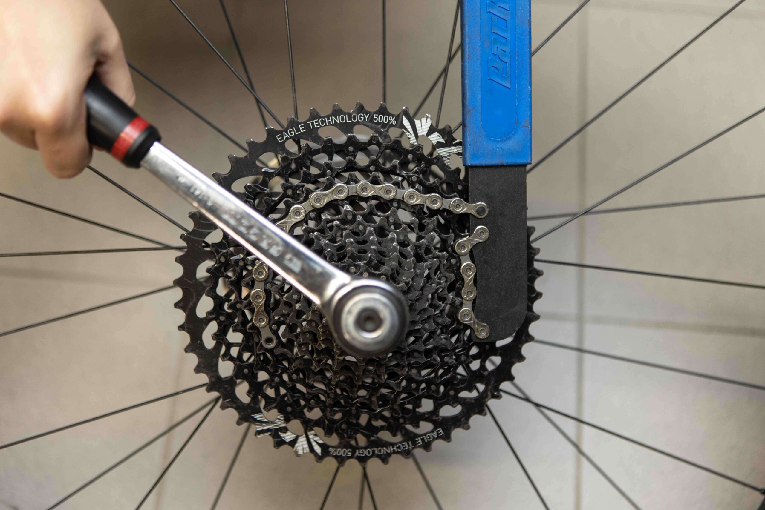 Als je dat basisonderhoud dus goed in acht neemt, blijf je lang probleemloos op pad. Het is wel zo dat je na langere tijd/afstand (ongeveer 1500km aldus KMC) eventueel met een zeer milde ontvetter even je werk kunt doen. Uiteindelijk blijft die emmer met heet water, een afwasmiddel en de borstel toch ‘themagic trick’. Voor de moeilijke hoekjes en kantjes in een cassette, tussen tandbladen en rondom je derailleur en derailleurwieltjes is de demontage ervan vaak een must om overal goed bij te kunnen. Dit is echter niet iets dat je continu moet doen, overdaad kan ook weer kwaad.