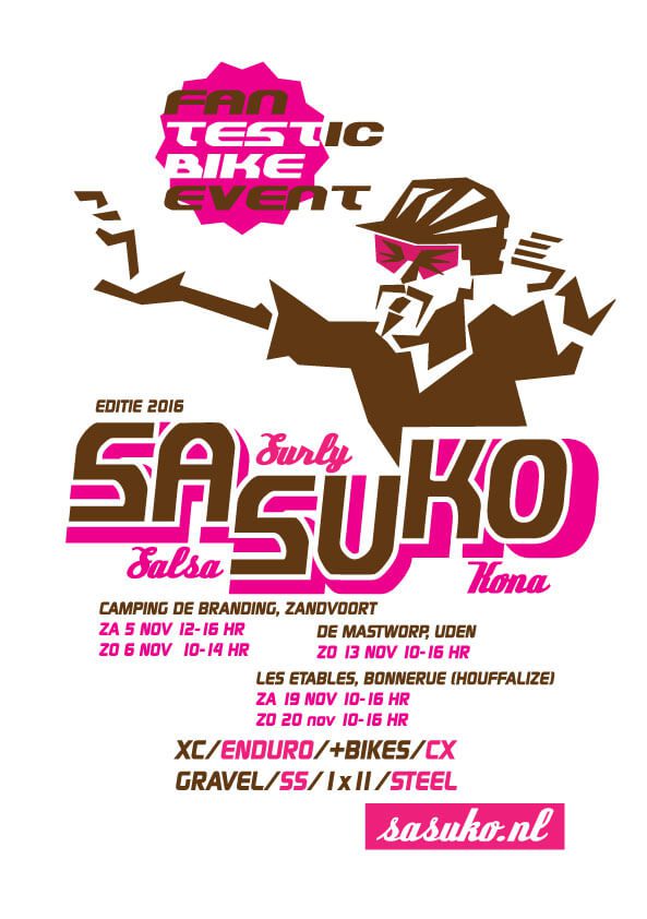 Rijplezier op niet alledaagse bikes, zo zou je Sasuko kunnen omschrijven. Op drie locaties in Nederland en België kun je bikes van Salsa, Surly en Kona testen. Op 5 en 6 november kun je hiervoor terecht bij Camping De Branding in Zandvoort (NL) op de vaste route. Op 13 november strijkt het circus Sasuko neer bij De Mastworp in Uden (NL) om te cruisen over de Bedafse heide. Een weekje later, op 19 en 20 november, verhuizen ze al die mountainbikes en gravelbikes naar België. Les Etables in Bonnerue (nabij Houffalize) is de plek waar je moet zijn om te genieten van een testrit door de Ardennen.