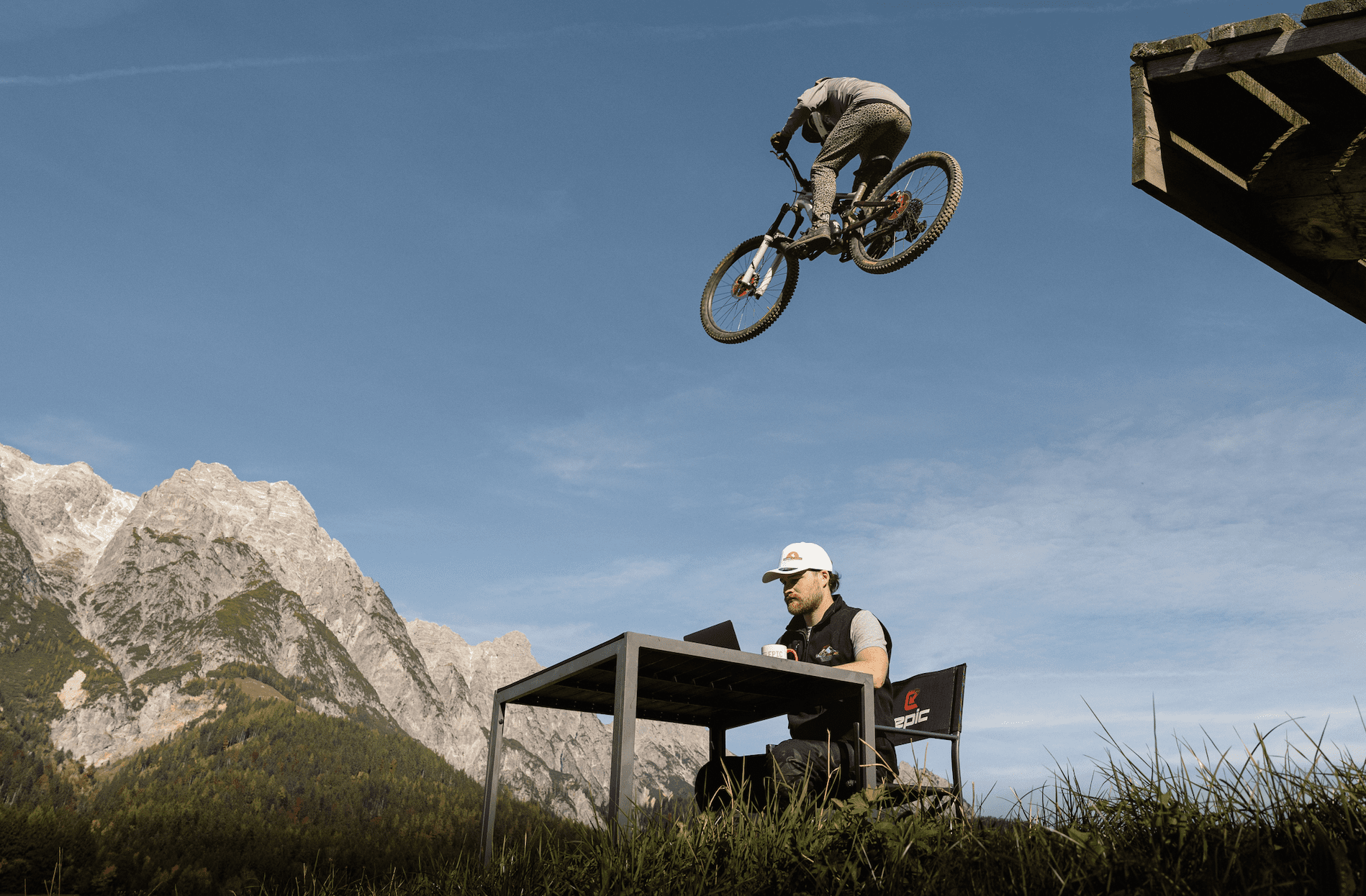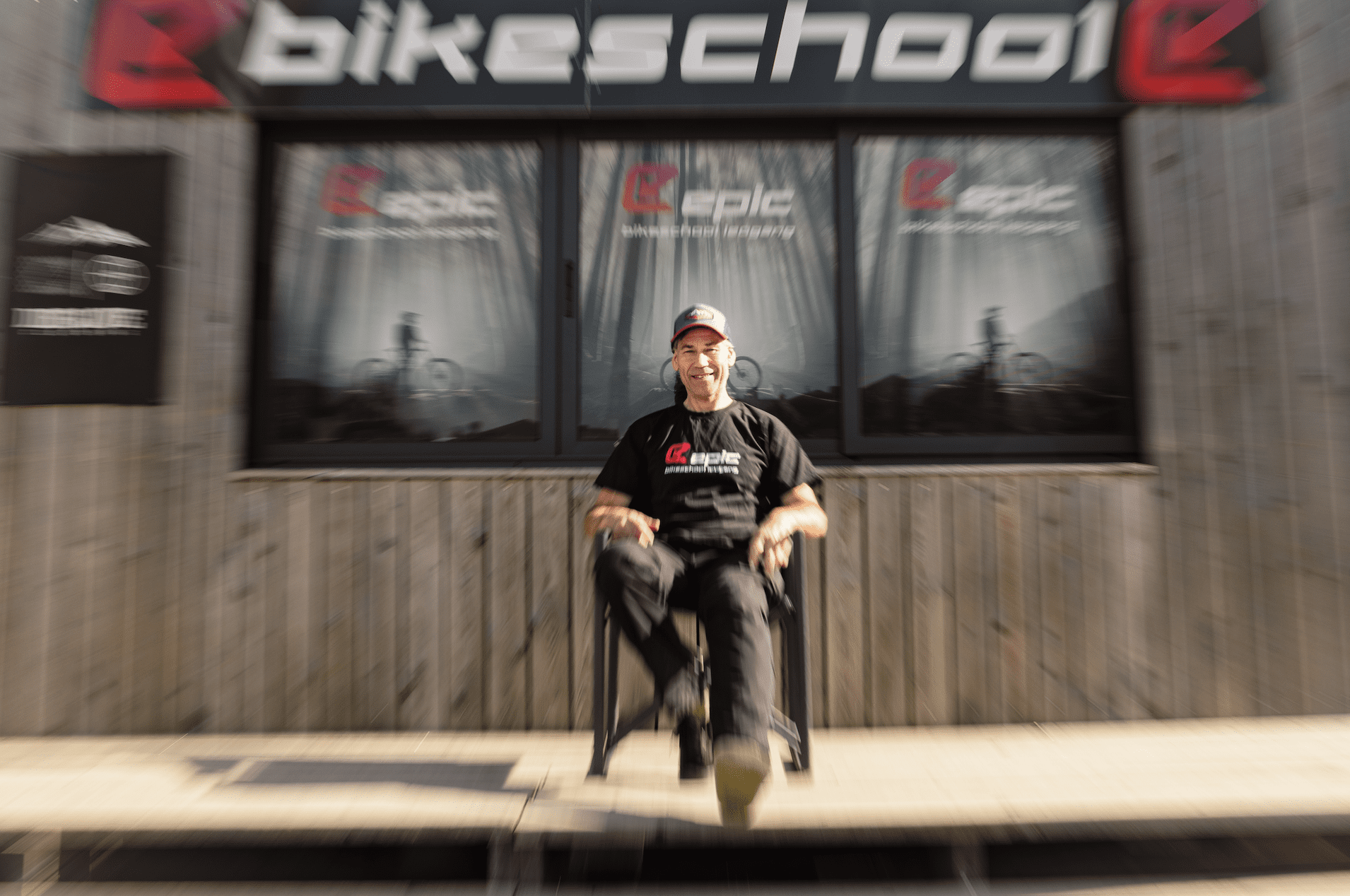 We zitten in het zonnetje voor de Epic Bike- schoolcontainer, een perfecte locatie, want veel trails eindigen hier; het ligt vlakbij de lift en de ‘riders playground’ ligt letterlijk op steenworp afstand. Hier is Sjoerd dan ook vaak te vinden met een groepje beginners. Al ruim dertig jaar is hij werkzaam in de Oostenrijkse bergen, eerst als eigenaar van een snowboardschool in Kaprun. In zijn twintiger jaren deed hij mee aan wedstrijden en trainde hij op de gletsjer in de zomer, maar om zijn conditie op peil te houden, zat hij ook veel op de mountainbike. In Kaprun werden toen, in de nineties, al downhillwedstrijden gehouden waaraan Sjoerd besloot deel te nemen en hij bereikte zelfs de finale. Een bikeschool is hij toen niet begonnen, omdat de downhilltrails niet vrij werden gegeven buiten de wedstrijden. Maar het vlammetje is altijd blijven wakkeren.