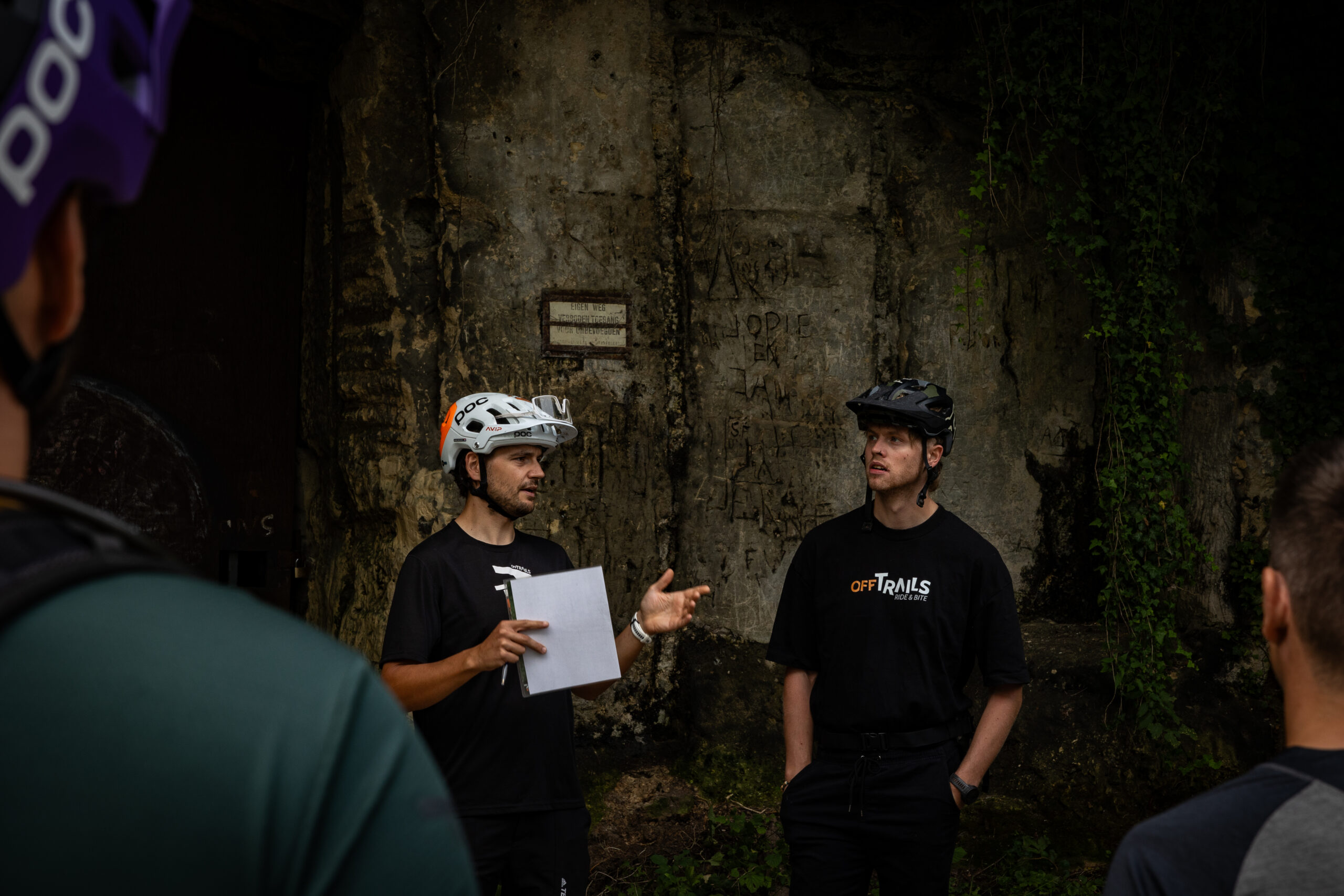 Bovenaan de Cauberg ligt een klein bikepark waar we eerst even genieten van onze wafels terwijl Menno uitlegt dat we hier in twee groepen gaan oefenen met verschillende skills: flow en drops. Floris neemt een groep mee en gaat aan de slag met het houden van flow tijdens je rit en Menno gaat aan de slag met het letterlijke (maar ook mentale) obstakel: de drop. Voor sommige deelnemers is dit de eerste keer en Menno neemt voldoende tijd om dit goed op te bouwen. De grijns op hun gezicht als ze het obstakel hebben overwonnen is onbetaalbaar.